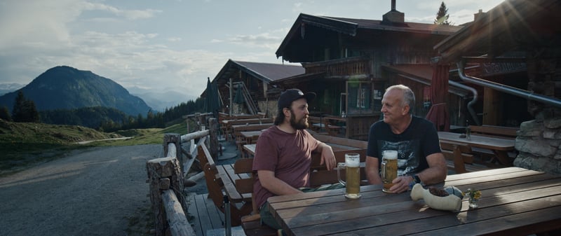 Christoph Bichler (Bierol) having a beer with his father Peter at Stoeffl-Huette on the Waller Alm, a mountain pasture in the Tyrolean Alps