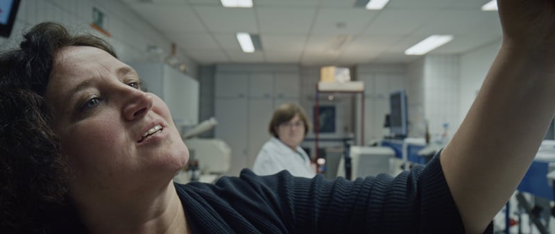 Anne-Françoise Pypaert, brewmaster at Orval, holding a bottle of Brettanomyces yeast against the light